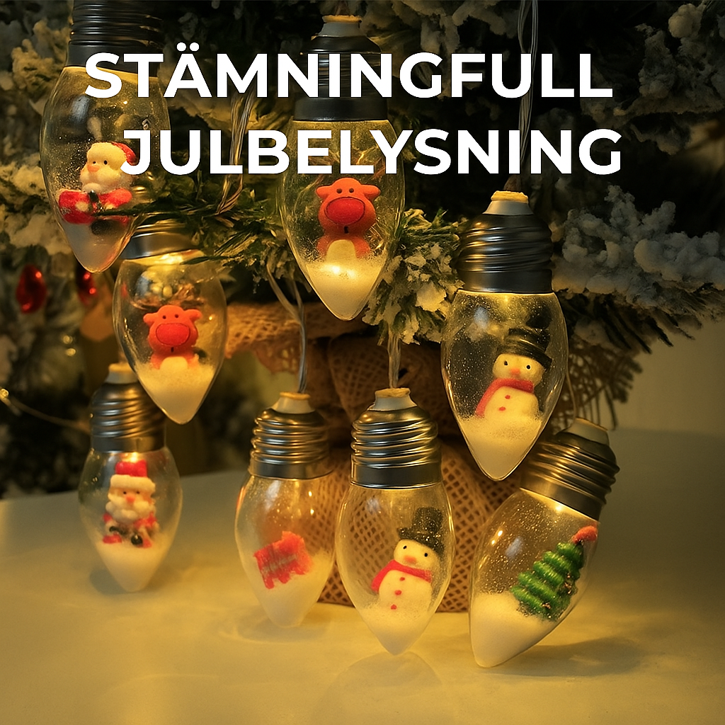 Ta hem julens magi med denna unika ljusslinga som sprider värme och glädje. Varje LED-lampa pryds av klassiska julmotiv som jultomten, snögubben och julgranen – tillsammans skapar de ett förtrollande ljusspel. Det mjuka och varma skenet gör varje rum omedelbart mer inbjudande och fyllt av julkänsla.