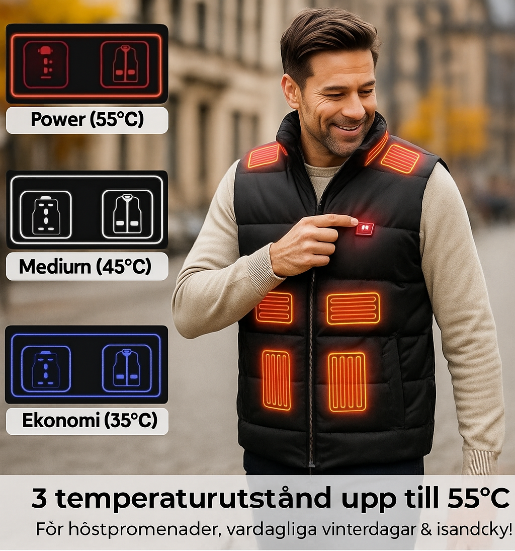 Med en enkel knapptryckning kan du växla mellan tre olika värmelägen, där den högsta temperaturen når upp till 55°C. Anpassa värmen efter vädret eller din egen komfort – du känner skillnaden inom några sekunder. Västen är idealisk för såväl milt kyliga dagar som för bitande vinterkyla.